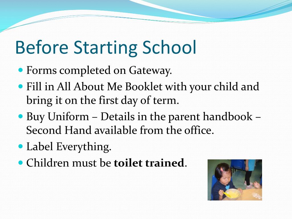 Before Starting School • Forms completed on Gateway. • Fill in All About Me Booklet with your child and bring it on the first day of term. • Buy Uniform – Details in the parent handbook – Second Hand available from the office. • Label Everything. • Children must be toilet trained.