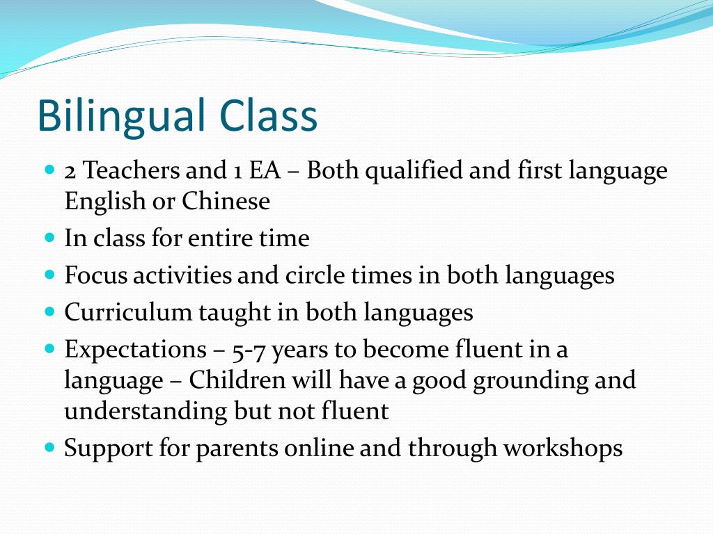 Bilingual Class • 2 Teachers and 1 EA – Both qualified and first language English or Chinese • In class for entire time • Focus activities and circle times in both languages • Curriculum taught in both languages • Expectations – 5-7 years to become fluent in a language – Children will have a good grounding and understanding but not fluent • Support for parents online and through workshops
