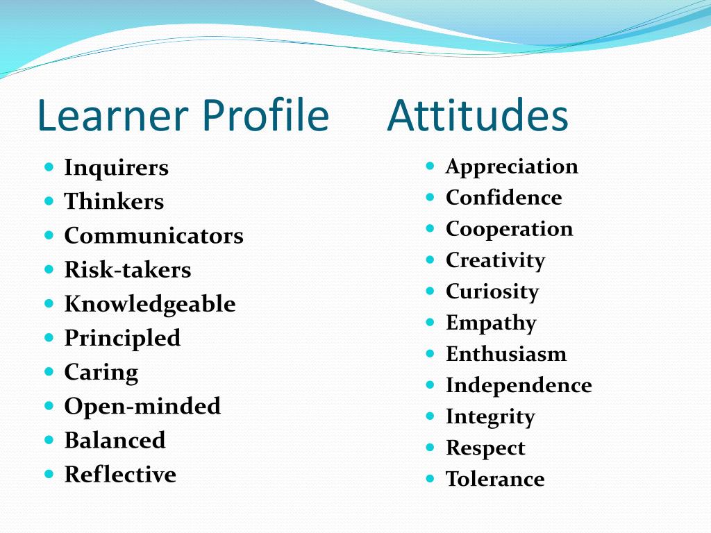 Learner Profile Attitudes • Inquirers • Thinkers • Communicators • Risk-takers • Knowledgeable • Principled • Caring • Open-minded • Balanced • Reflective • Appreciation • Confidence • Cooperation • Creativity • Curiosity • Empathy • Enthusiasm • Independence • Integrity • Respect • Tolerance