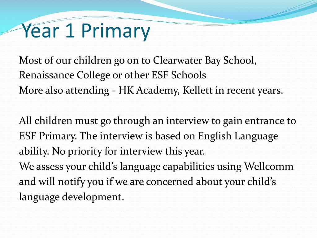 Year 1 Primary Most of our children go on to Clearwater Bay School, Renaissance College or other ESF Schools More also attending - HK Academy, Kellett in recent years. All children must go through an interview to gain entrance to ESF Primary. The interview is based on English Language ability. No priority for interview this year. We assess your child’s language capabilities using Wellcomm and will notify you if we are concerned about your child’s language development.