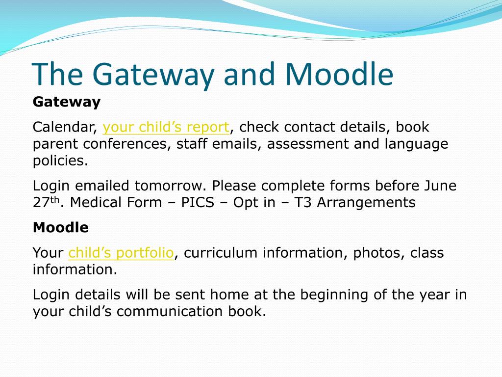 The Gateway and Moodle Gateway Calendar, your child’s report, check contact details, book parent conferences, staff emails, assessment and language policies. Login emailed tomorrow. Please complete forms before June 27th. Medical Form – PICS – Opt in – T3 Arrangements Moodle Your child’s portfolio, curriculum information, photos, class information. Login details will be sent home at the beginning of the year in your child’s communication book.