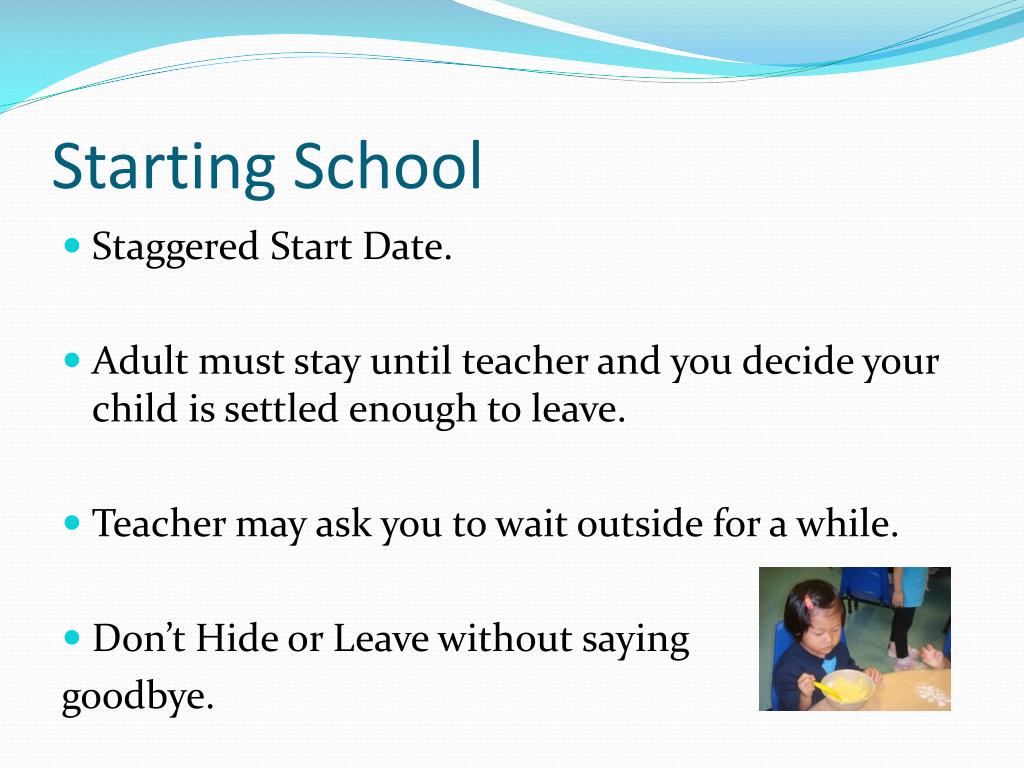 Starting School • Staggered Start Date. • Adult must stay until teacher and you decide your child is settled enough to leave. • Teacher may ask you to wait outside for a while. • Don’t Hide or Leave without saying goodbye.