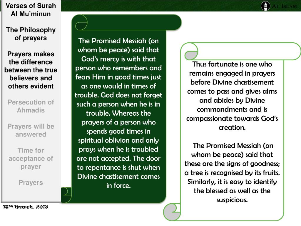 Verses of Surah Al Mu’minun The Philosophy of prayers Prayers makes the difference between the true believers and others evident Persecution of Ahmadis Prayers will be answered Time for acceptance of prayer Prayers However, we should always be mindful that any influence we may have will not be for worldly objectives. Rather, it will be to establish the kingdom of God on earth and to spread love and peace in the world. 15th March, 2013