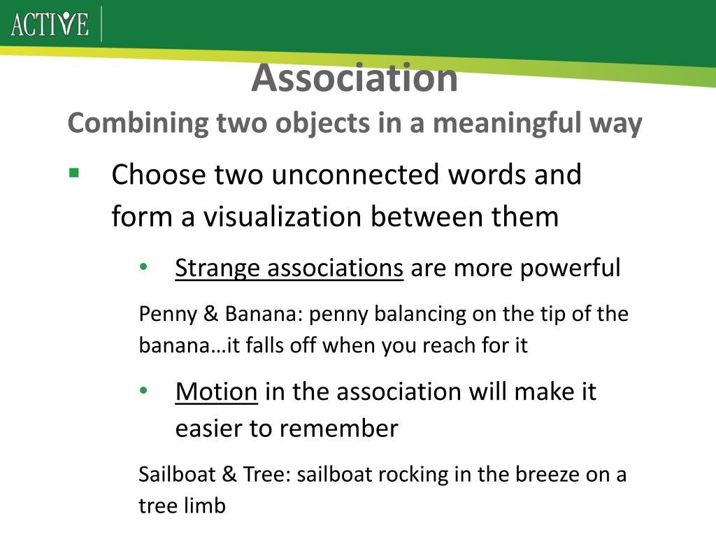 AssociationCombining two objects in a meaningful way Choose two unconnected words and form a visualization between them Strange associations are more powerful Penny & Banana: penny balancing on the tip of the banana…it falls off when you reach for it Motion in the association will make it easier to remember Sailboat & Tree: sailboat rocking in the breeze on a tree limb