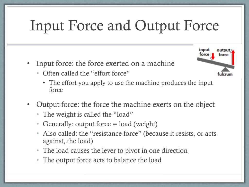 Input Force and Output Force • Input force: the force exerted on a machine • Often called the “effort force” • The effort you apply to use the machine produces the input force • Output force: the force the machine exerts on the object • The weight is called the “load” • Generally: output force = load (weight) • Also called: the “resistance force” (because it resists, or acts against, the load) • The load causes the lever to pivot in one direction • The output force acts to balance the load