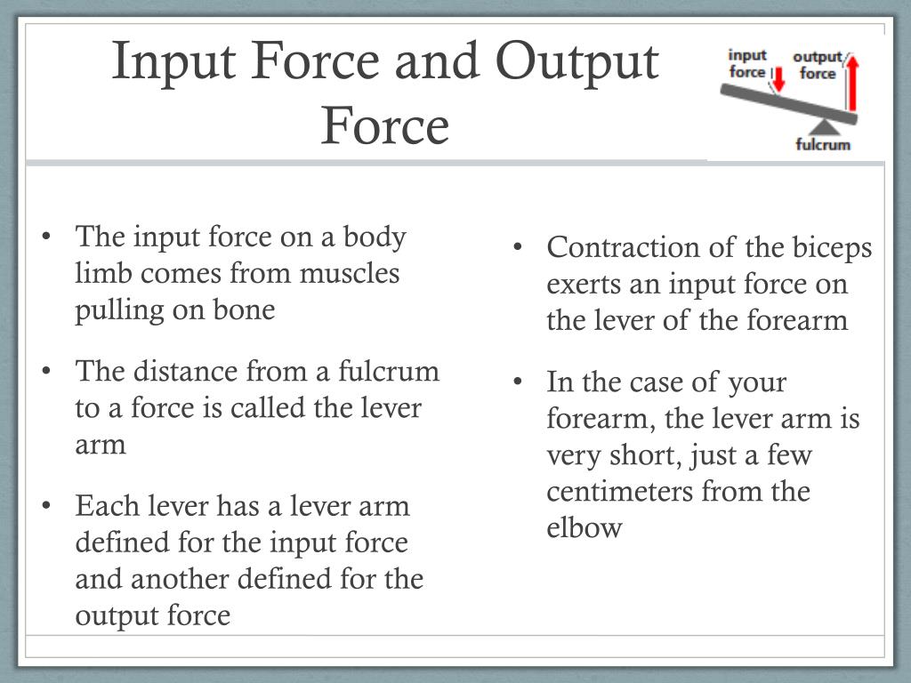 Input Force and Output Force • The input force on a body limb comes from muscles pulling on bone • The distance from a fulcrum to a force is called the lever arm • Each lever has a lever arm defined for the input force and another defined for the output force • Contraction of the biceps exerts an input force on the lever of the forearm • In the case of your forearm, the lever arm is very short, just a few centimeters from the elbow