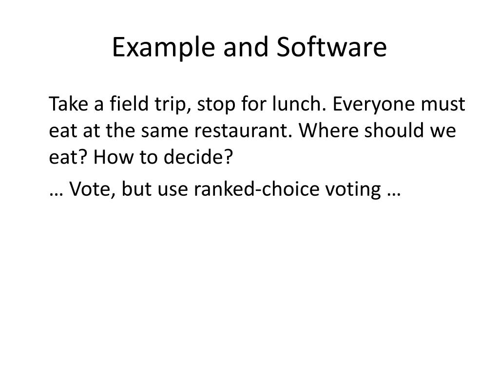 Example and Software Take a field trip, stop for lunch. Everyone must eat at the same restaurant. Where should we eat? How to decide? … Vote, but use ranked-choice voting …