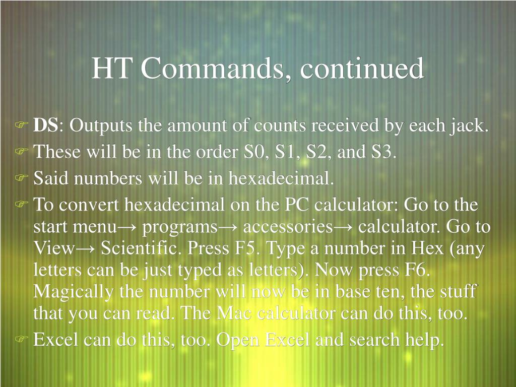 HT Commands, continued • DS: Outputs the amount of counts received by each jack. • These will be in the order S0, S1, S2, and S3. • Said numbers will be in hexadecimal. • To convert hexadecimal on the PC calculator: Go to the start menu→ programs→ accessories→ calculator. Go to View→ Scientific. Press F5. Type a number in Hex (any letters can be just typed as letters). Now press F6. Magically the number will now be in base ten, the stuff that you can read. The Mac calculator can do this, too. • Excel can do this, too. Open Excel and search help.