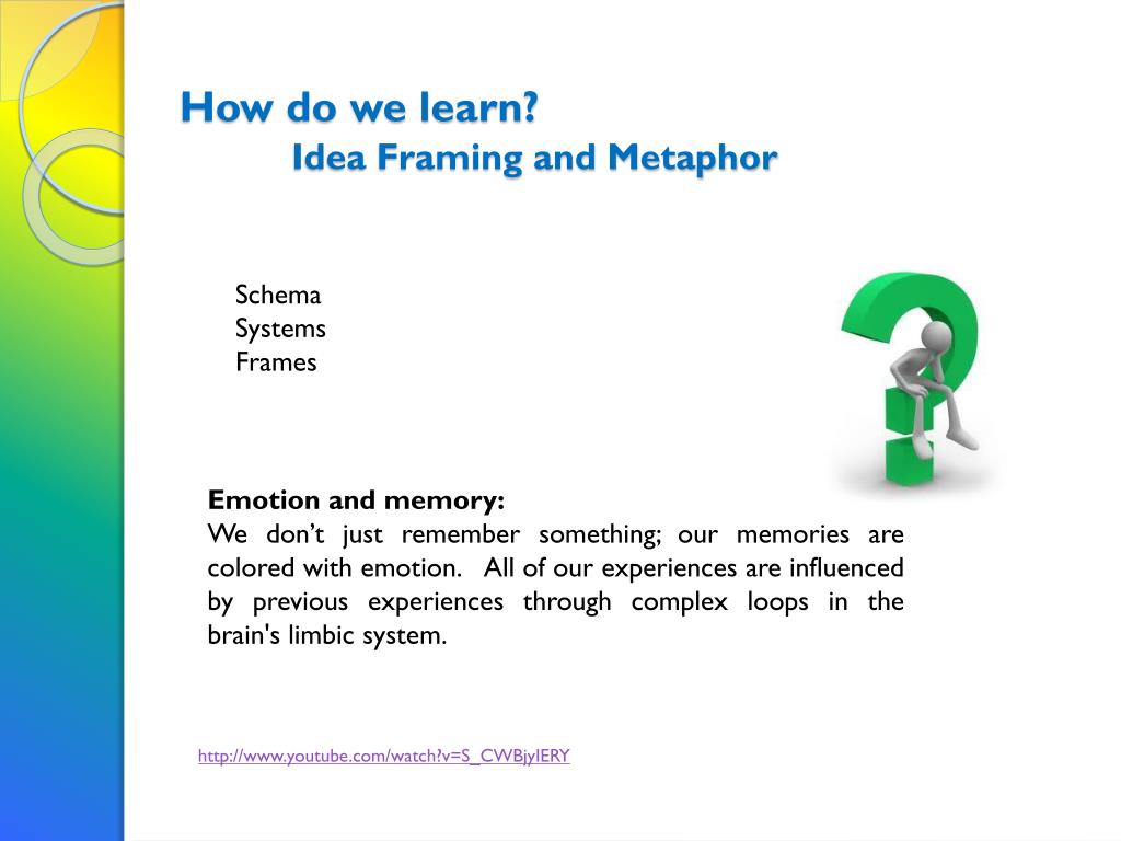 How do we learn?Idea Framing and Metaphor Schema Systems Frames Emotion and memory: We don’t just remember something; our memories are colored with emotion. All of our experiences are influenced by previous experiences through complex loops in the brain's limbic system. http://www.youtube.com/watch?v=S_CWBjyIERY