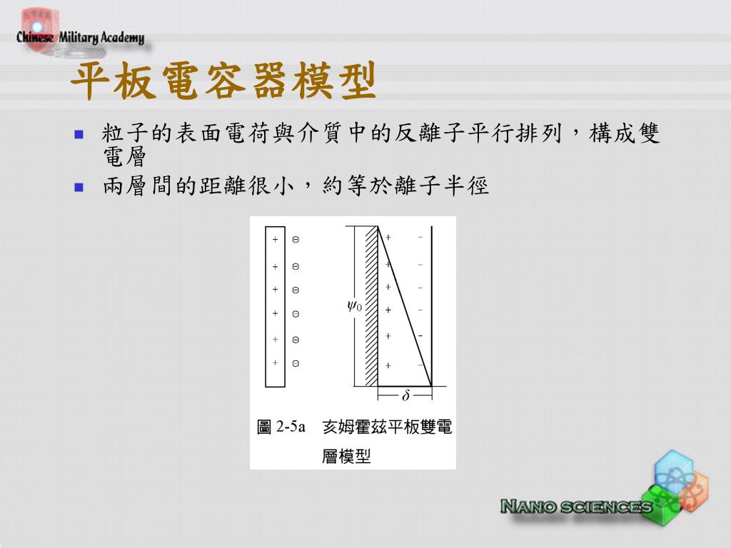 平板電容器模型 • 粒子的表面電荷與介質中的反離子平行排列,構成雙電層 • 兩層間的距離很小,約等於離子半徑