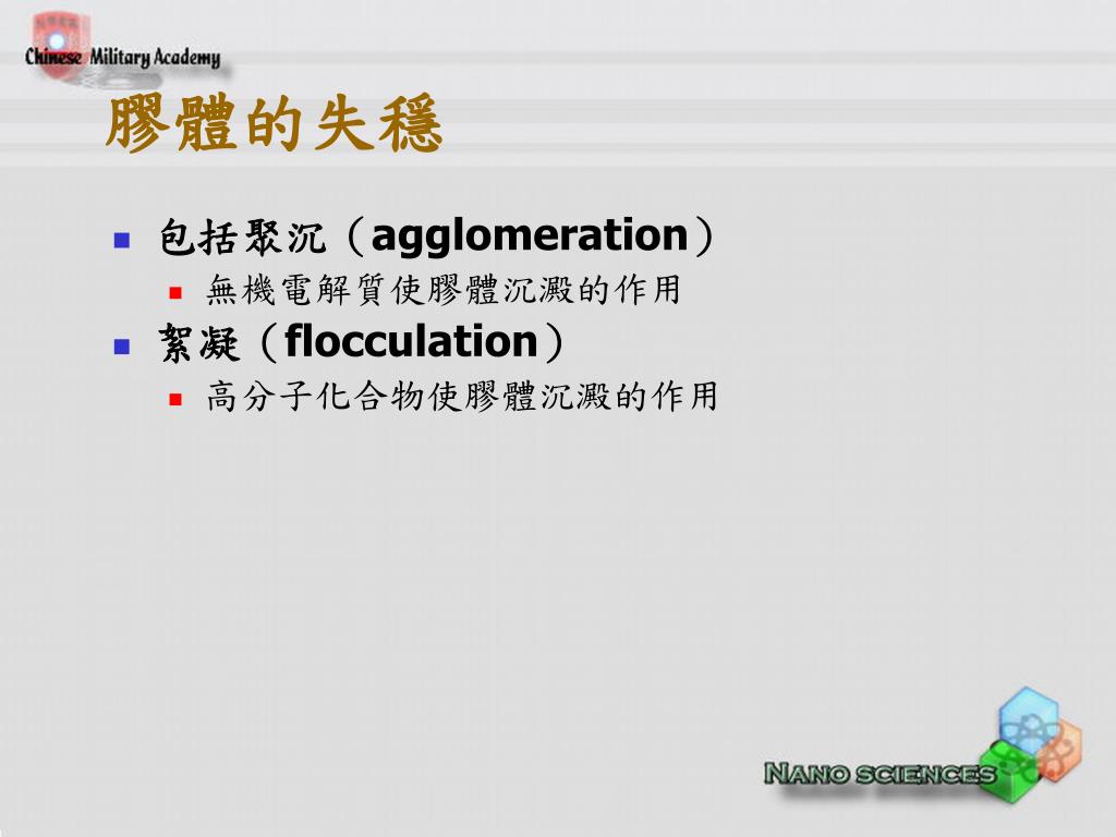 膠體的失穩 • 包括聚沉(agglomeration) • 無機電解質使膠體沉澱的作用 • 絮凝(flocculation) • 高分子化合物使膠體沉澱的作用