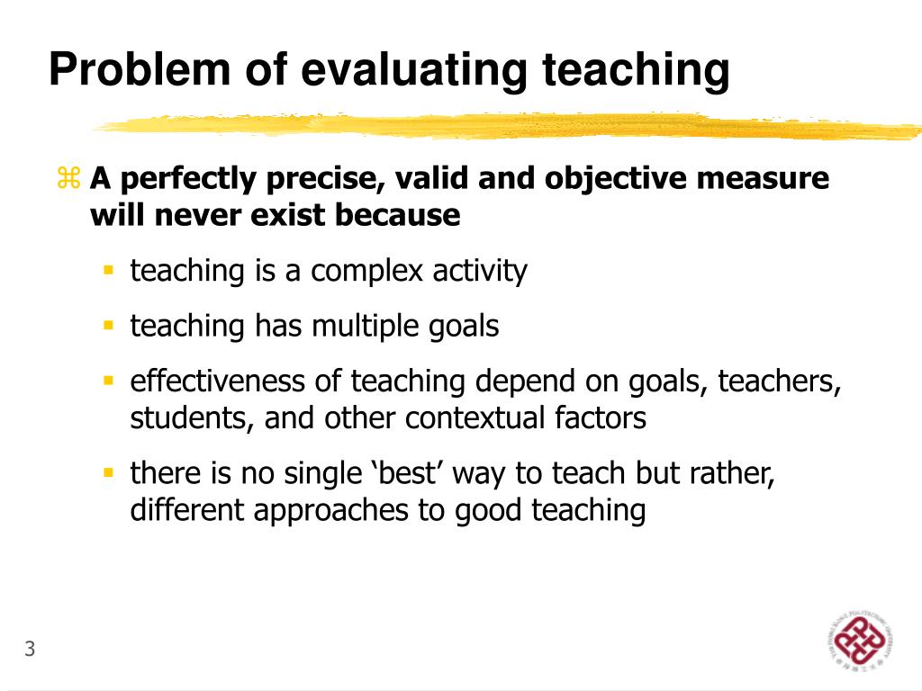 Problem of evaluating teaching • A perfectly precise, valid and objective measure will never exist because • teaching is a complex activity • teaching has multiple goals • effectiveness of teaching depend on goals, teachers, students, and other contextual factors • there is no single ‘best’ way to teach but rather, different approaches to good teaching