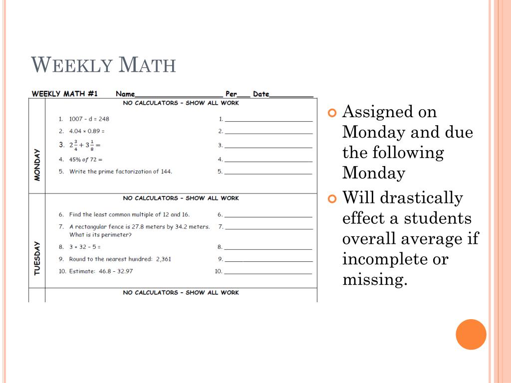Weekly Math • Assigned on Monday and due the following Monday • Will drastically effect a students overall average if incomplete or missing.