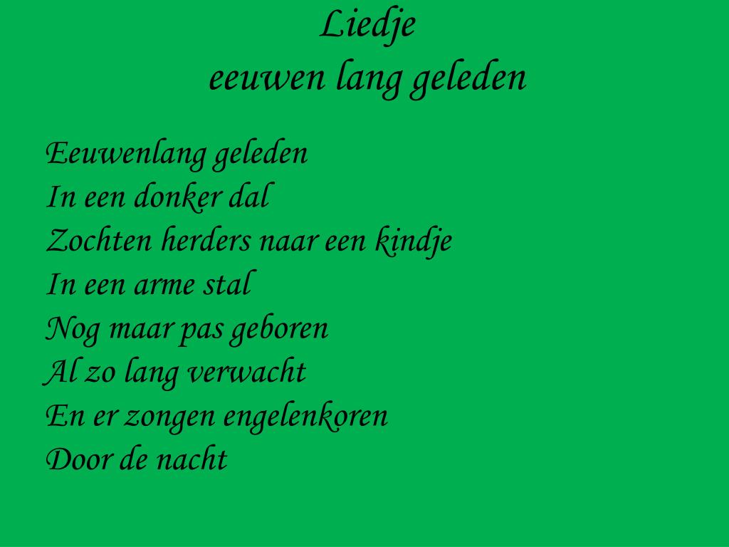 Liedjeeeuwen lang geleden Eeuwenlang geledenIn een donker dalZochten herders naar een kindjeIn een arme stalNog maar pas geborenAl zo lang verwachtEn er zongen engelenkorenDoor de nacht