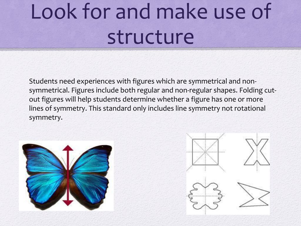 Look for and make use of structure Students need experiences with figures which are symmetrical and non-symmetrical. Figures include both regular and non-regular shapes. Folding cut-out figures will help students determine whether a figure has one or more lines of symmetry. This standard only includes line symmetry not rotational symmetry.