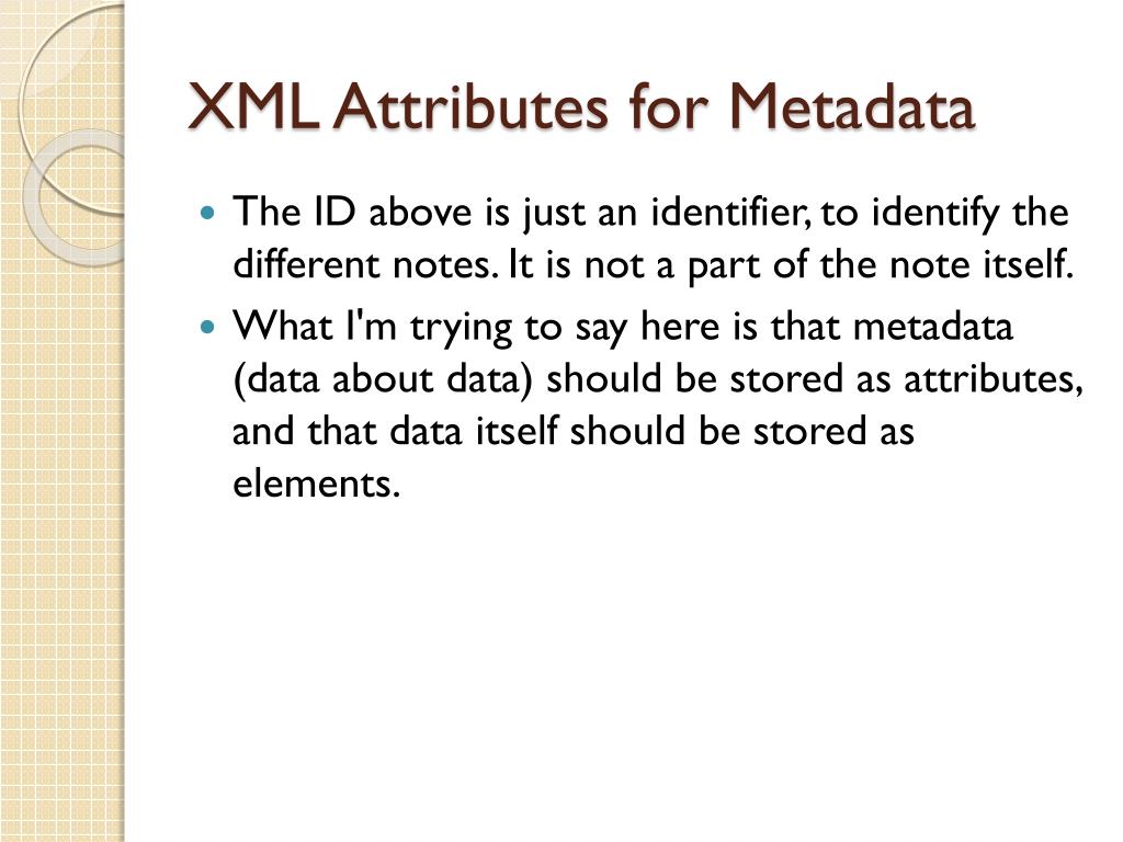 XML Attributes for Metadata • The ID above is just an identifier, to identify the different notes. It is not a part of the note itself. • What I'm trying to say here is that metadata (data about data) should be stored as attributes, and that data itself should be stored as elements.