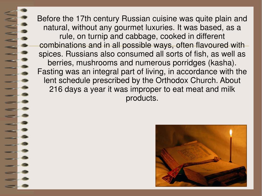 Before the 17th century Russian cuisine was quite plain and natural, without any gourmet luxuries. It was based, as a rule, on turnip and cabbage, cooked in different combinations and in all possible ways, often flavoured with spices. Russians also consumed all sorts of fish, as well as berries, mushrooms and numerous porridges (kasha). Fasting was an integral part of living, in accordance with the lent schedule prescribed by the Orthodox Church. About 216 days a year it was improper to eat meat and milk products.