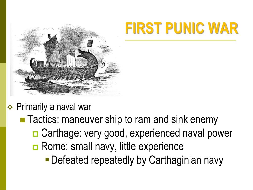 FIRST PUNIC WAR • Primarily a naval war • Tactics: maneuver ship to ram and sink enemy • Carthage: very good, experienced naval power • Rome: small navy, little experience • Defeated repeatedly by Carthaginian navy