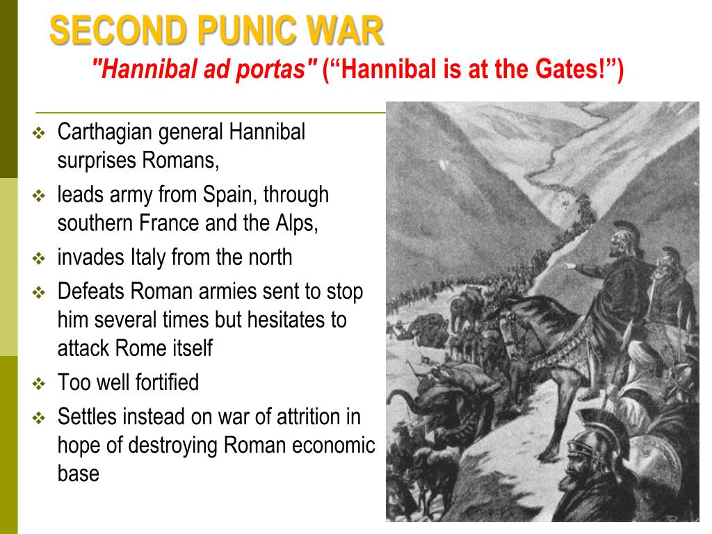 SECOND PUNIC WAR "Hannibal ad portas" (“Hannibal is at the Gates!”) • Carthagian general Hannibal surprises Romans, • leads army from Spain, through southern France and the Alps, • invades Italy from the north • Defeats Roman armies sent to stop him several times but hesitates to attack Rome itself • Too well fortified • Settles instead on war of attrition in hope of destroying Roman economic base