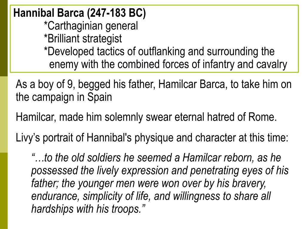 Hannibal Barca (247-183 BC) *Carthaginian general *Brilliant strategist *Developed tactics of outflanking and surrounding the enemy with the combined forces of infantry and cavalry As a boy of 9, begged his father, HamilcarBarca, to take him on the campaign in Spain Hamilcar, made him solemnly swear eternal hatred of Rome. • Livy’s portrait of Hannibal's physique and character at this time: • “…to the old soldiers he seemed a Hamilcar reborn, as he possessed the lively expression and penetrating eyes of his father; the younger men were won over by his bravery, endurance, simplicity of life, and willingness to share all hardships with his troops.”