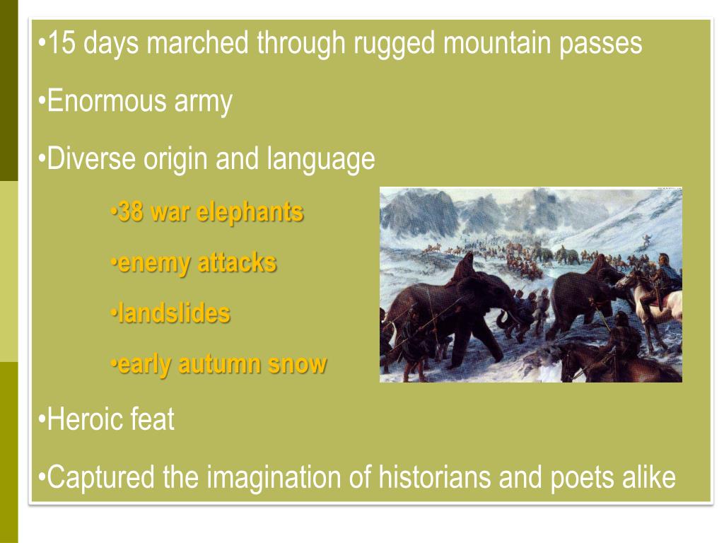 15 days marched through rugged mountain passes • Enormous army • Diverse origin and language • 38 war elephants • enemy attacks • landslides • early autumn snow • Heroic feat • Captured the imagination of historians and poets alike