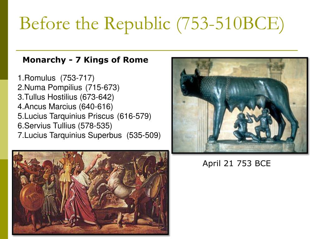 Before the Republic (753-510BCE) Monarchy - 7 Kings of Rome • Romulus (753-717) • Numa Pompilius (715-673) • Tullus Hostilius (673-642) • Ancus Marcius (640-616) • Lucius Tarquinius Priscus(616-579) • Servius Tullius (578-535) • Lucius Tarquinius Superbus (535-509) April 21 753 BCE