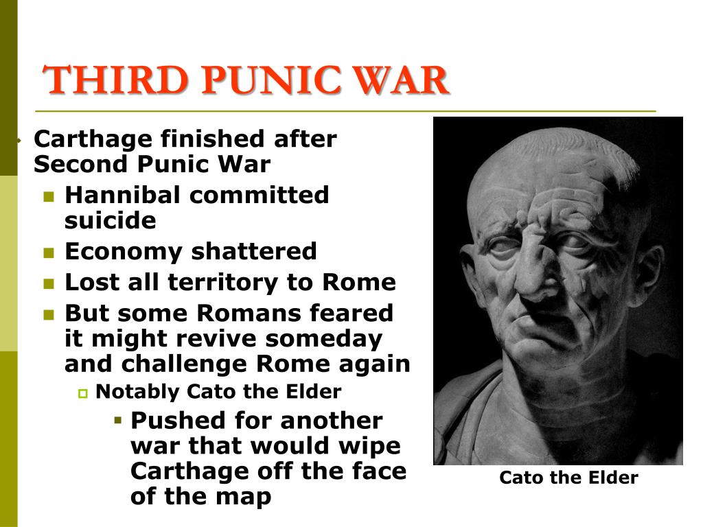 THIRD PUNIC WAR • Carthage finished after Second Punic War • Hannibal committed suicide • Economy shattered • Lost all territory to Rome • But some Romans feared it might revive someday and challenge Rome again • Notably Cato the Elder • Pushed for another war that would wipe Carthage off the face of the map Cato the Elder