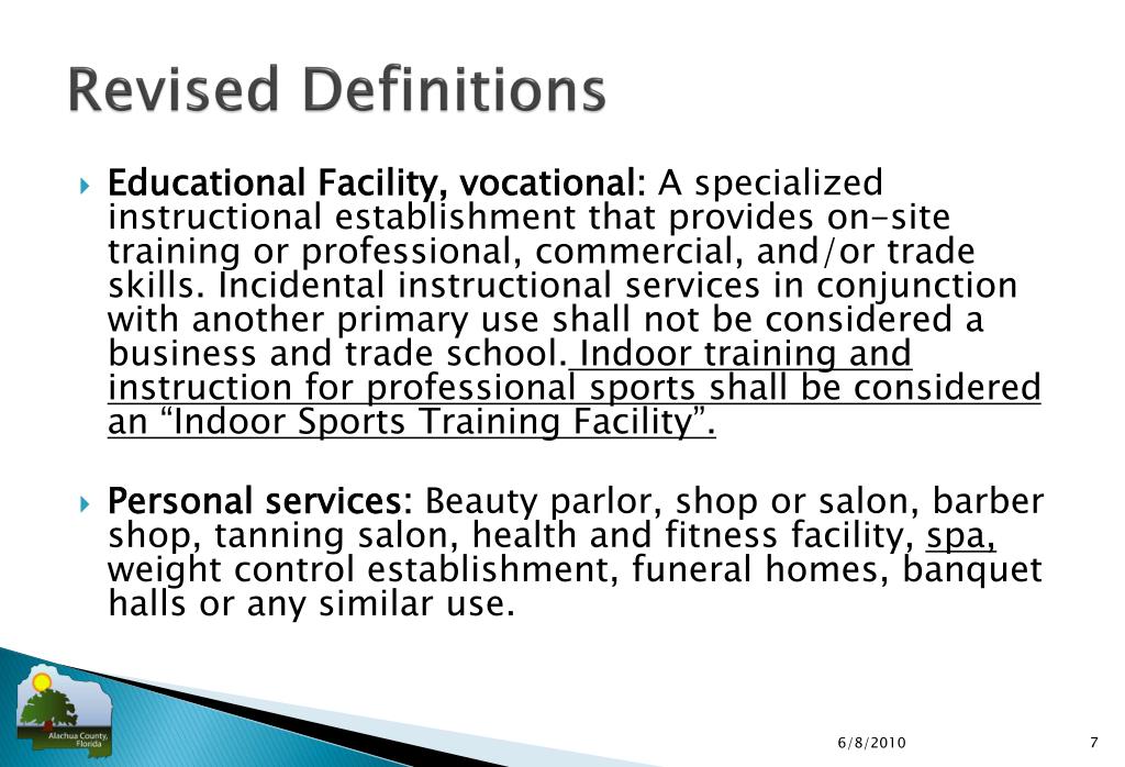 Revised Definitions • Educational Facility, vocational: A specialized instructional establishment that provides on-site training or professional, commercial, and/or trade skills. Incidental instructional services in conjunction with another primary use shall not be considered a business and trade school. Indoor training and instruction for professional sports shall be considered an “Indoor Sports Training Facility”. • Personal services: Beauty parlor, shop or salon, barber shop, tanning salon, health and fitness facility, spa, weight control establishment, funeral homes, banquet halls or any similar use.