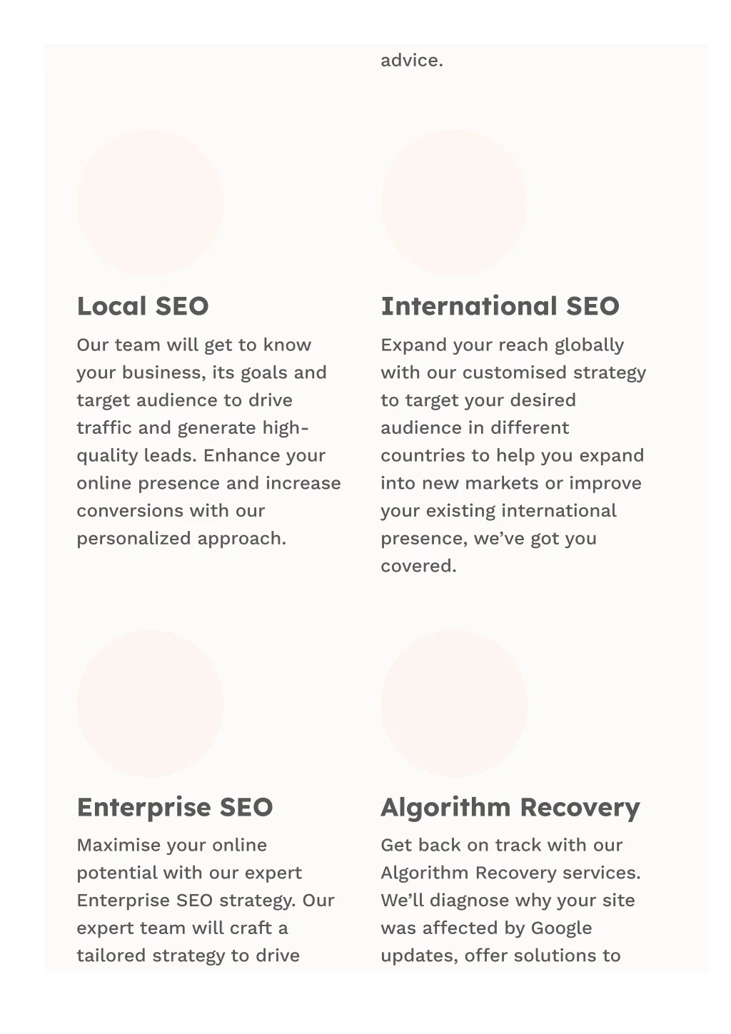 advice. Local SEO International SEO Ourteamwillgettoknow Expandyourreachglobally yourbusiness,itsgoalsand withourcustomisedstrategy targetaudiencetodrive totargetyourdesired tra?candgeneratehigh- audienceindi?erent qualityleads.Enhanceyour countriestohelpyouexpand onlinepresenceandincrease intonewmarketsorimprove conversionswithour yourexistinginternational personalizedapproach. presence,we’vegotyou covered. Enterprise SEO Algorithm Recovery Maximiseyouronline Getbackontrackwithour potentialwithourexpert AlgorithmRecoveryservices. EnterpriseSEOstrategy.Our We’lldiagnosewhyyoursite expertteamwillcrafta wasa?ectedbyGoogle tailoredstrategytodrive updates,o?ersolutionsto