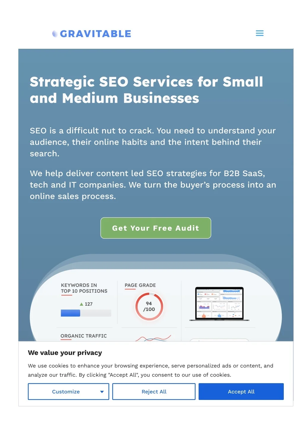 a a Strategic SEO Services for Small and Medium Businesses SEOisadi?cultnuttocrack.Youneedtounderstandyour audience,theironlinehabitsandtheintentbehindtheir search. WehelpdelivercontentledSEOstrategiesforB2BSaaS, techandITcompanies.Weturnthebuyer’sprocessintoan onlinesalesprocess. GetYourFreeAudit Wevalueyourprivacy Weusecookiestoenhanceyourbrowsingexperience,servepersonalizedadsorcontent,and analyzeourtra?c.Byclicking "AcceptAll",youconsenttoouruseofcookies. Customize RejectAll AcceptAll