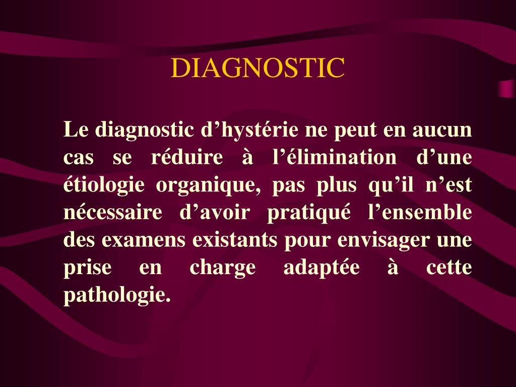 DIAGNOSTIC Le diagnostic d’hystérie ne peut en aucun cas se réduire à l’élimination d’une étiologie organique, pas plus qu’il n’est nécessaire d’avoir pratiqué l’ensemble des examens existants pour envisager une prise en charge adaptée à cette pathologie.