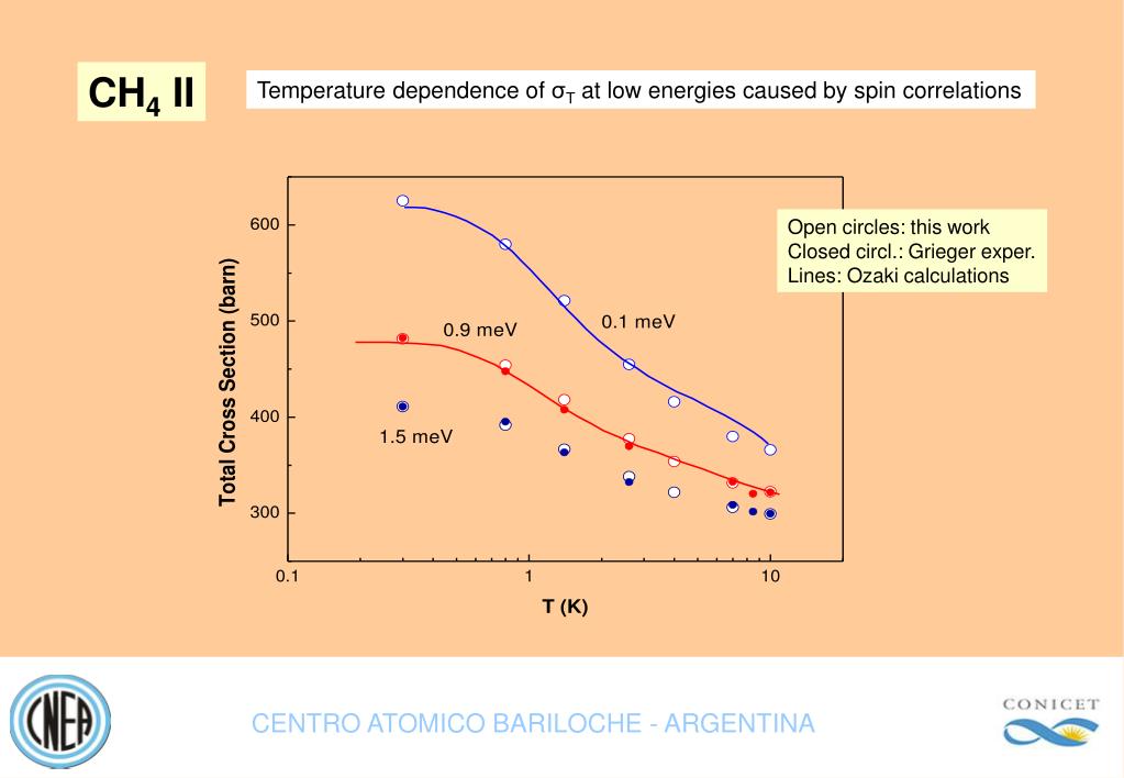 CH4 II Temperature dependence of σT at low energies caused by spin correlations Open circles: this work Closed circl.: Grieger exper. Lines: Ozaki calculations CENTRO ATOMICO BARILOCHE - ARGENTINA