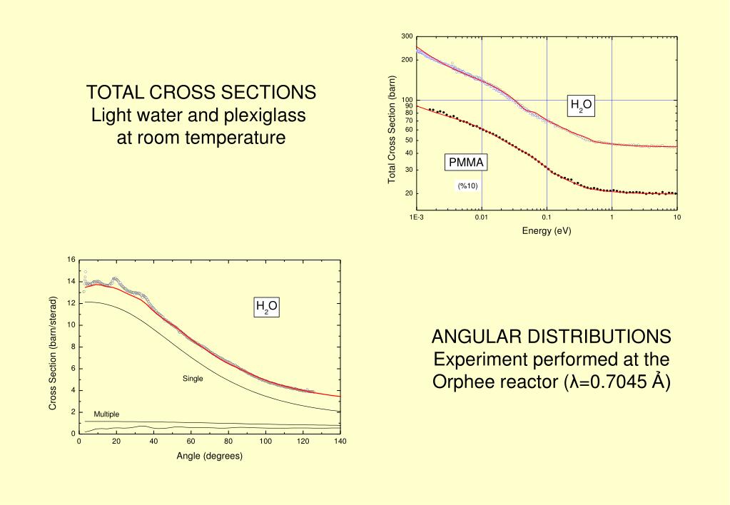 TOTAL CROSS SECTIONS Light water and plexiglass at room temperature ANGULAR DISTRIBUTIONS Experiment performed at the Orphee reactor (λ=0.7045 Ả)