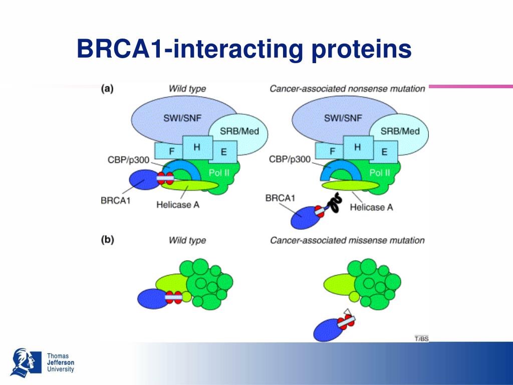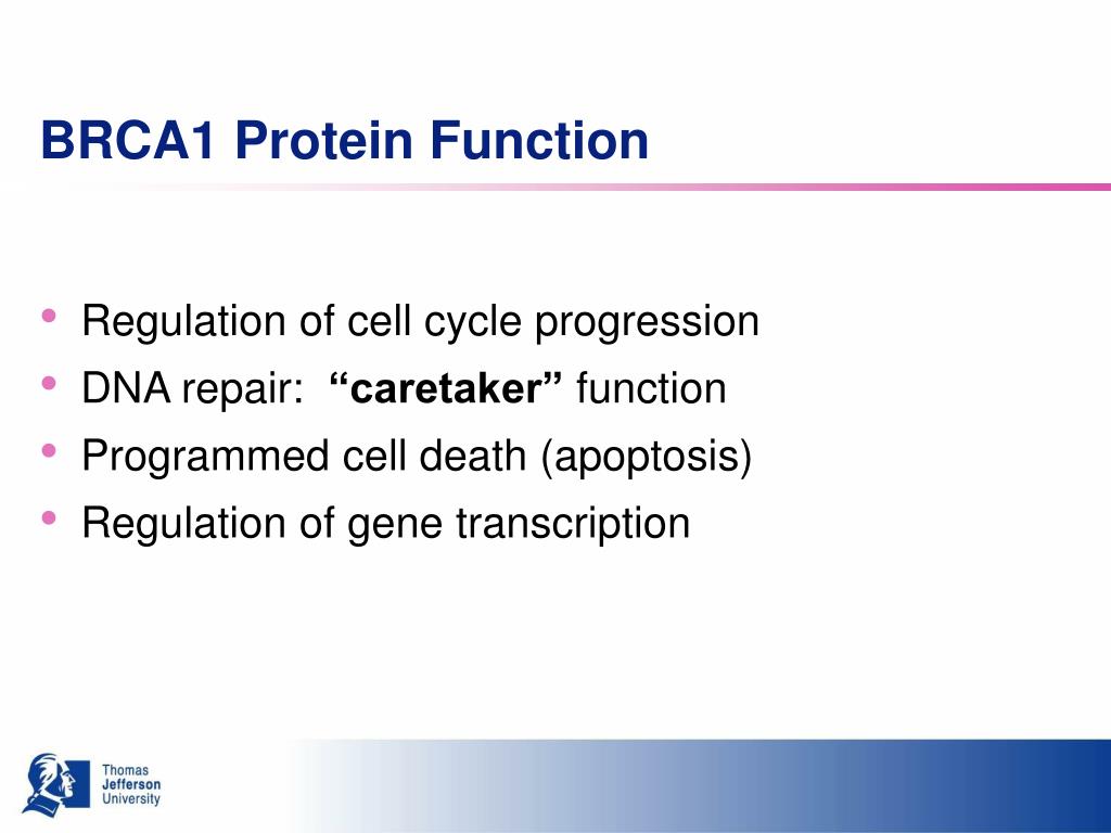 BRCA1 Protein Function • Regulation of cell cycle progression • DNA repair: “caretaker” function • Programmed cell death (apoptosis) • Regulation of gene transcription