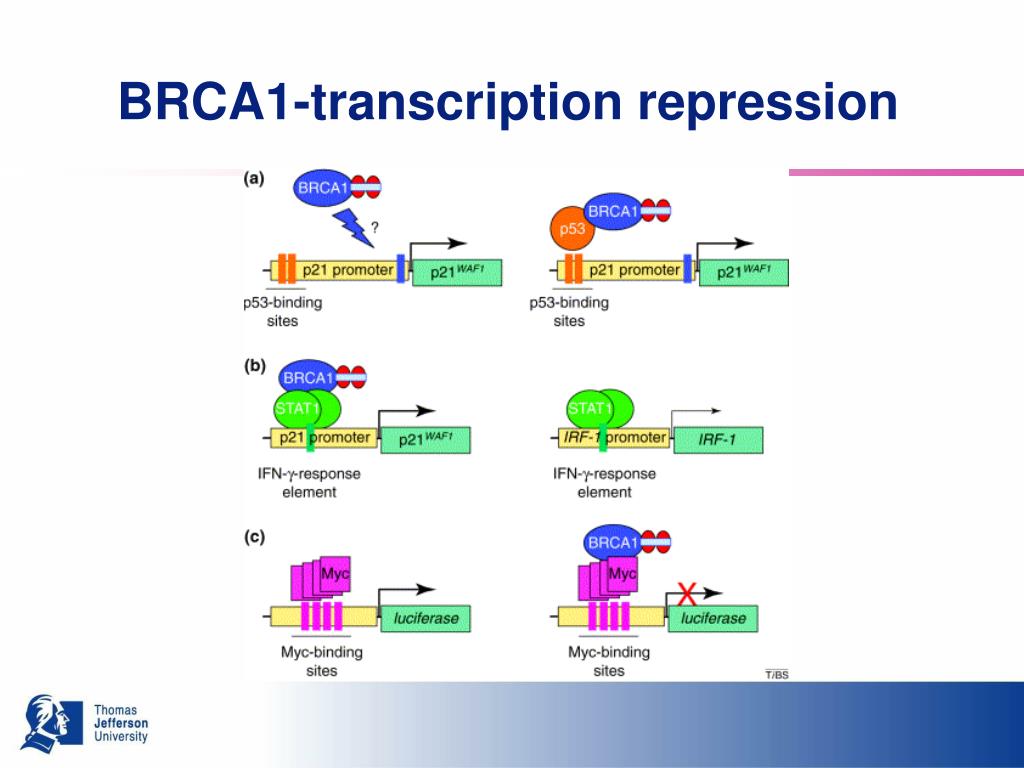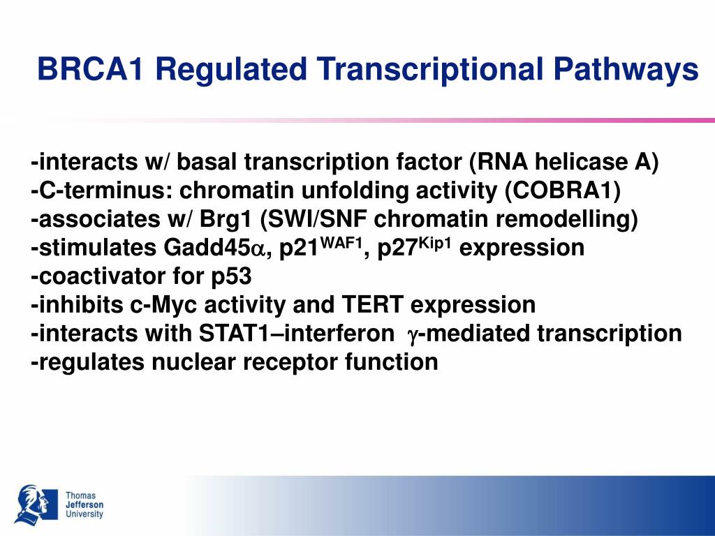 BRCA1 Regulated Transcriptional Pathways -interacts w/ basal transcription factor (RNA helicase A) -C-terminus: chromatin unfolding activity (COBRA1) -associates w/ Brg1 (SWI/SNF chromatin remodelling) -stimulates Gadd45, p21WAF1, p27Kip1 expression -coactivator for p53 -inhibits c-Myc activity and TERT expression -interacts with STAT1–interferon -mediated transcription -regulates nuclear receptor function