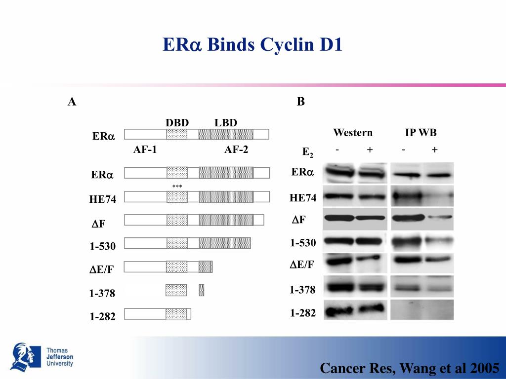 ER Binds Cyclin D1 A B DBD LBD Western IP WB ER + + - - AF-1 AF-2 E2 ER ER *** HE74 HE74 F F 1-530 1-530 E/F E/F 1-378 1-378 1-282 1-282 Cancer Res, Wang et al 2005