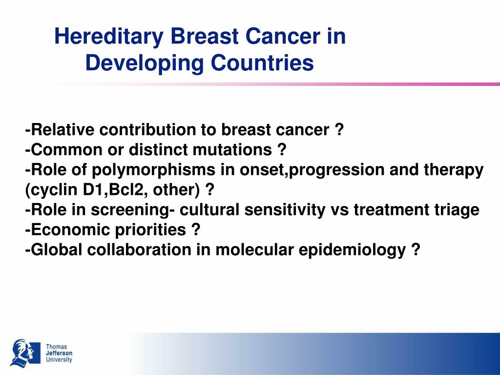 Hereditary Breast Cancer in Developing Countries -Relative contribution to breast cancer ? -Common or distinct mutations ? -Role of polymorphisms in onset,progression and therapy (cyclin D1,Bcl2, other) ? -Role in screening- cultural sensitivity vs treatment triage -Economic priorities ? -Global collaboration in molecular epidemiology ?