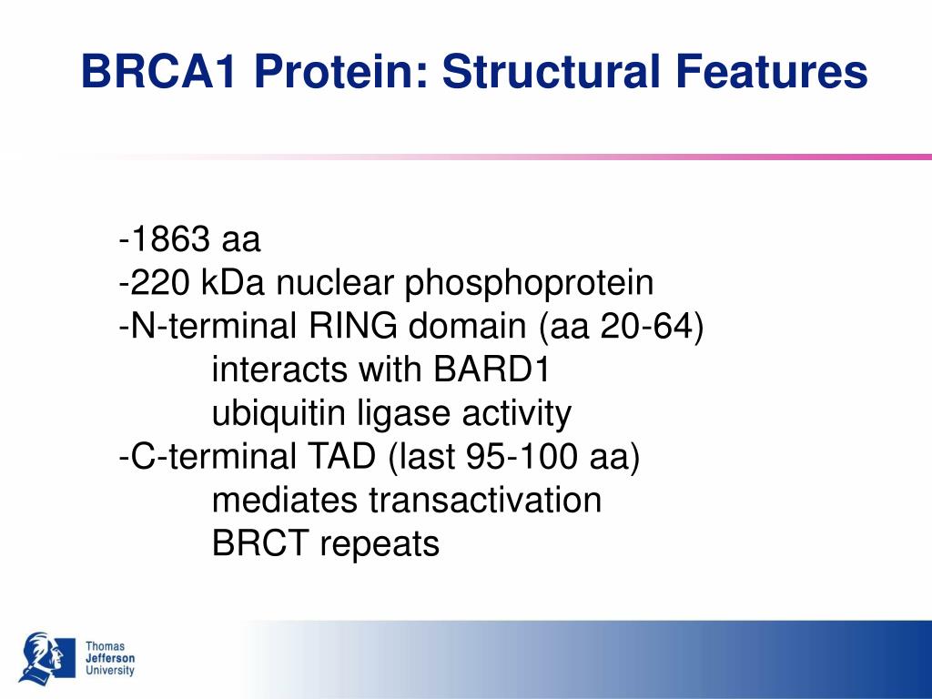 BRCA1 Protein: Structural Features -1863 aa -220 kDa nuclear phosphoprotein -N-terminal RING domain (aa 20-64) interacts with BARD1 ubiquitin ligase activity -C-terminal TAD (last 95-100 aa) mediates transactivation BRCT repeats