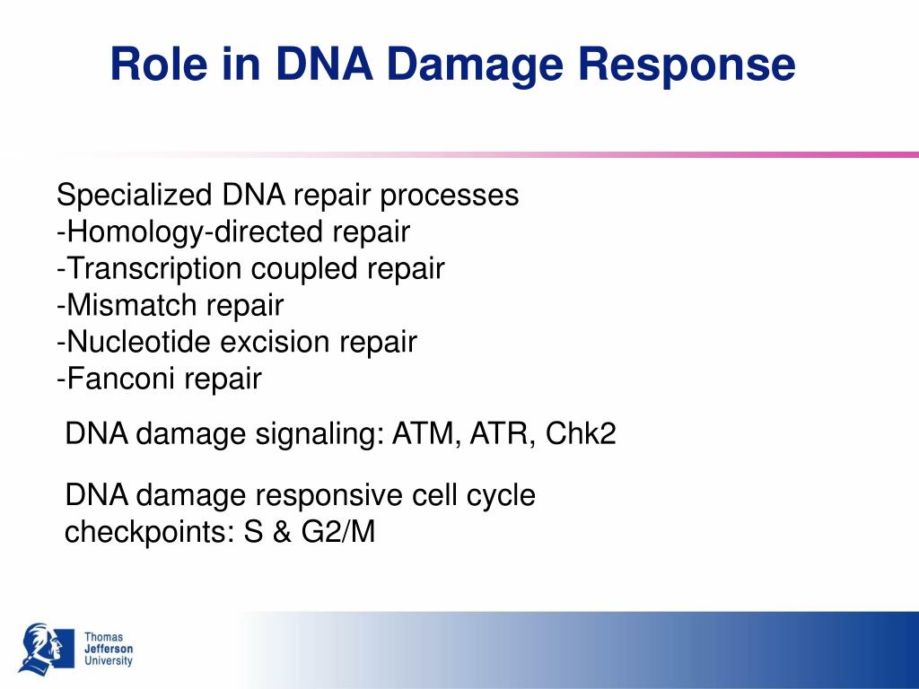 Role in DNA Damage Response Specialized DNA repair processes -Homology-directed repair -Transcription coupled repair -Mismatch repair -Nucleotide excision repair -Fanconi repair DNA damage signaling: ATM, ATR, Chk2 DNA damage responsive cell cycle checkpoints: S & G2/M