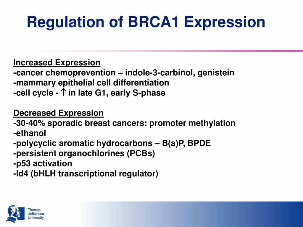 Regulation of BRCA1 Expression Increased Expression -cancer chemoprevention – indole-3-carbinol, genistein -mammary epithelial cell differentiation -cell cycle - in late G1, early S-phase Decreased Expression -30-40% sporadic breast cancers: promoter methylation -ethanol -polycyclic aromatic hydrocarbons – B(a)P, BPDE -persistent organochlorines (PCBs) -p53 activation -Id4 (bHLH transcriptional regulator)