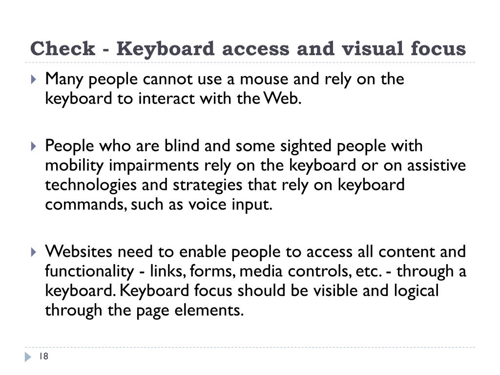 Check - Keyboard access and visual focus • Many people cannot use a mouse and rely on the keyboard to interact with the Web. • People who are blind and some sighted people with mobility impairments rely on the keyboard or on assistive technologies and strategies that rely on keyboard commands, such as voice input. • Websites need to enable people to access all content and functionality - links, forms, media controls, etc. - through a keyboard. Keyboard focus should be visible and logical through the page elements.
