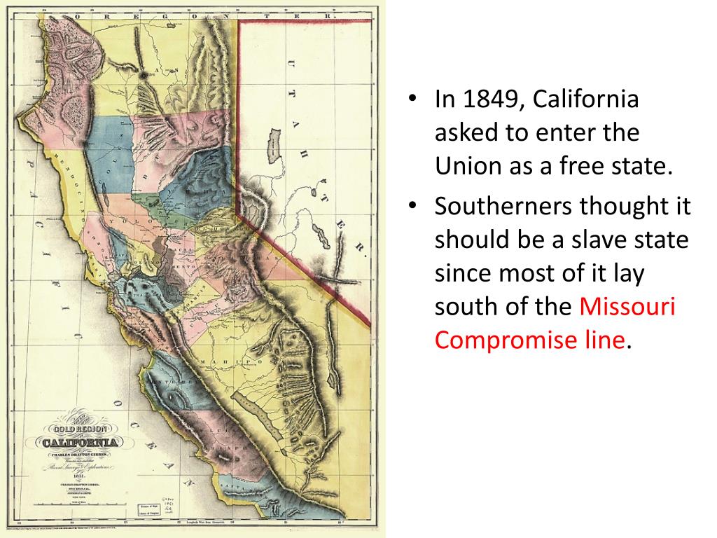 In 1849, California asked to enter the Union as a free state. • Southerners thought it should be a slave state since most of it lay south of the Missouri Compromise line.