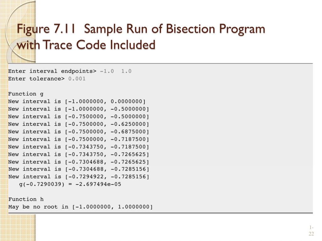 Figure 7.11 Sample Run of Bisection Program with Trace Code Included