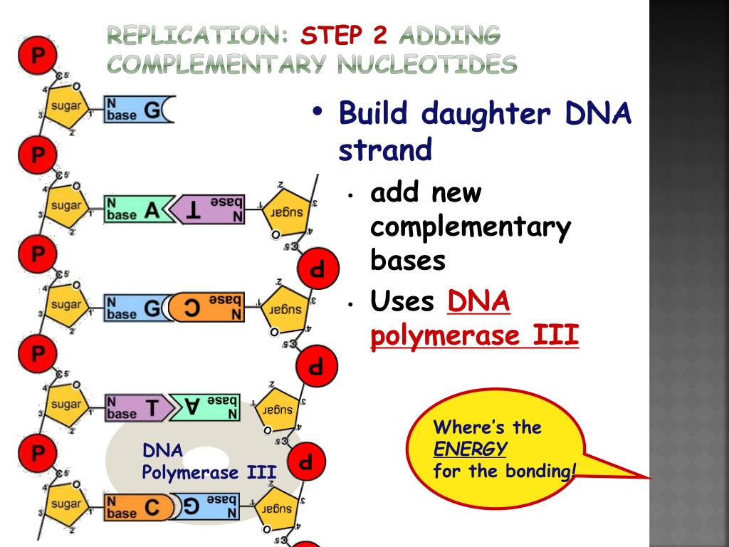 Replication: step 2 Adding Complementary Nucleotides • Build daughter DNA strand • add new complementary bases • Uses DNA polymerase III Where’s theENERGYfor the bonding! DNA Polymerase III