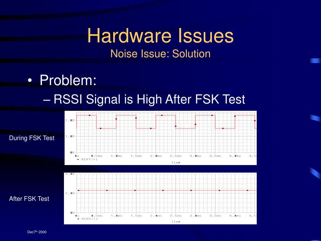 Hardware IssuesNoise Issue: Solution • Problem: • RSSI Signal is High After FSK Test During FSK Test After FSK Test