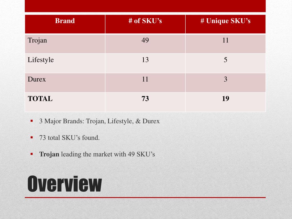 3 Major Brands: Trojan, Lifestyle, & Durex 73 total SKU’s found. Trojan leading the market with 49 SKU’s Overview