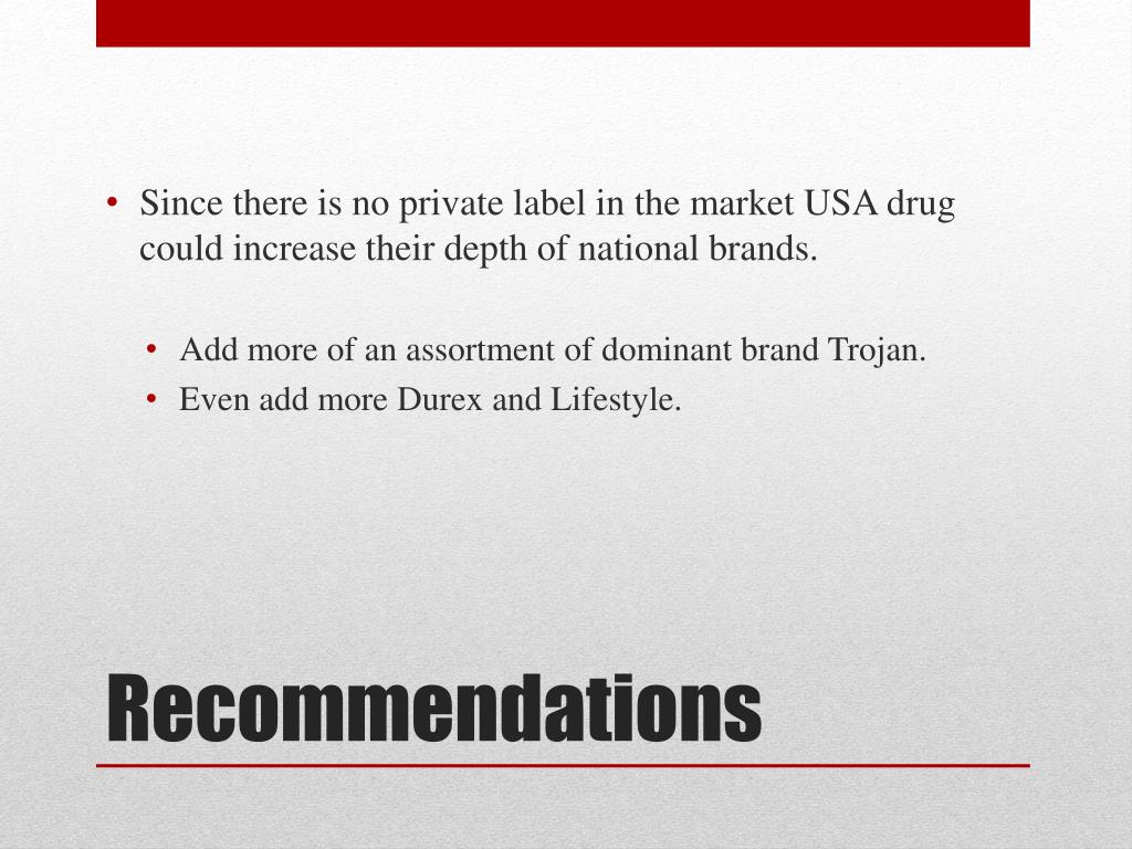Since there is no private label in the market USA drug could increase their depth of national brands. • Add more of an assortment of dominant brand Trojan. • Even add more Durex and Lifestyle. Recommendations