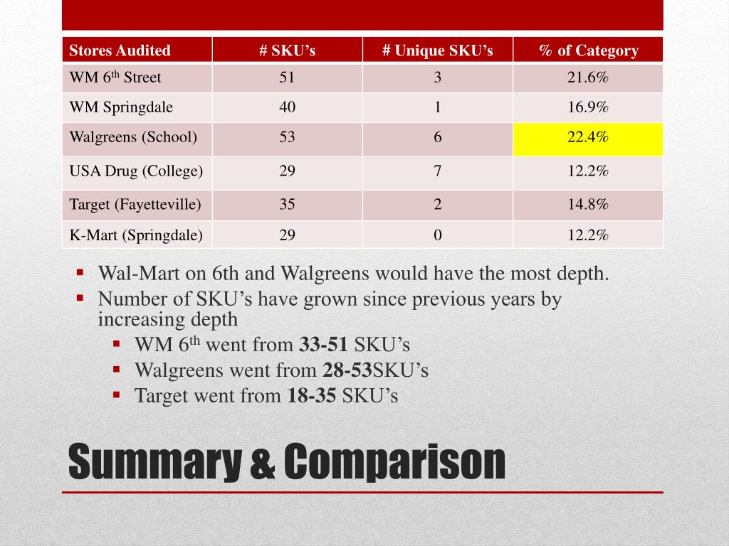 Wal-Mart on 6th and Walgreens would have the most depth. Number of SKU’s have grown since previous years by increasing depth WM 6th went from 33-51 SKU’s Walgreens went from 28-53SKU’s Target went from 18-35 SKU’s Summary & Comparison