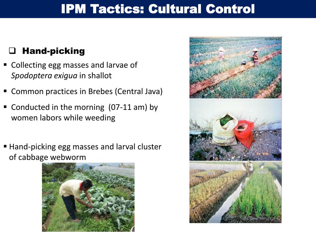 IPM Tactics: Cultural Control • Hand-picking • Collecting egg masses and larvae of • Spodopteraexiguain shallot • Common practices in Brebes (Central Java) • Conducted in the morning (07-11 am) by • women labors while weeding • Hand-picking egg masses and larval cluster • of cabbage webworm