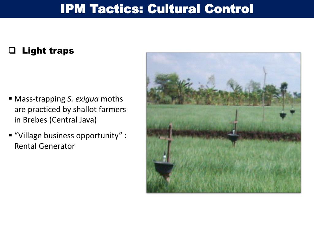 IPM Tactics: Cultural Control • Light traps • Mass-trapping S. exiguamoths • are practiced by shallot farmers • in Brebes (Central Java) • “Village business opportunity” : • Rental Generator